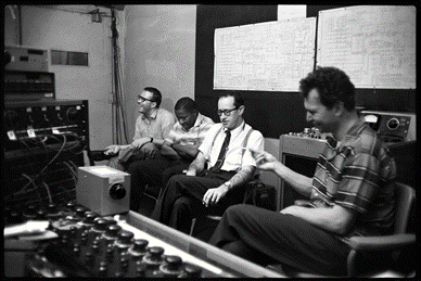 7․ Դոն Հանստայնի (Don Hunstein) լուսանկարը Դեյվ Բրուբեկի խմբի «Time Out» ալբոմի ձայնագրման ընթացքից․ այն հետագայում դարձավ աշխարհի ամենահայտնի ալբոմներից մեկը։